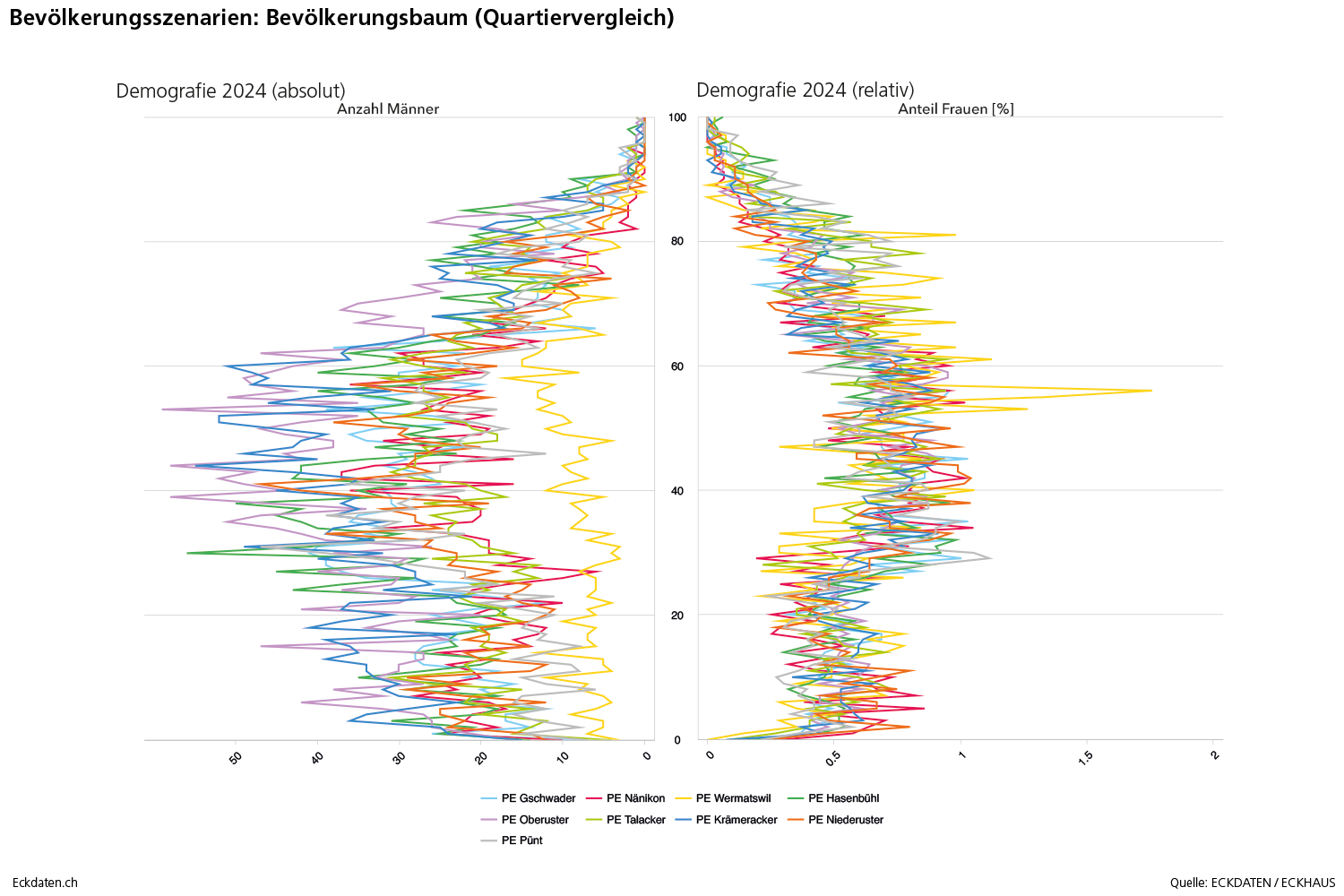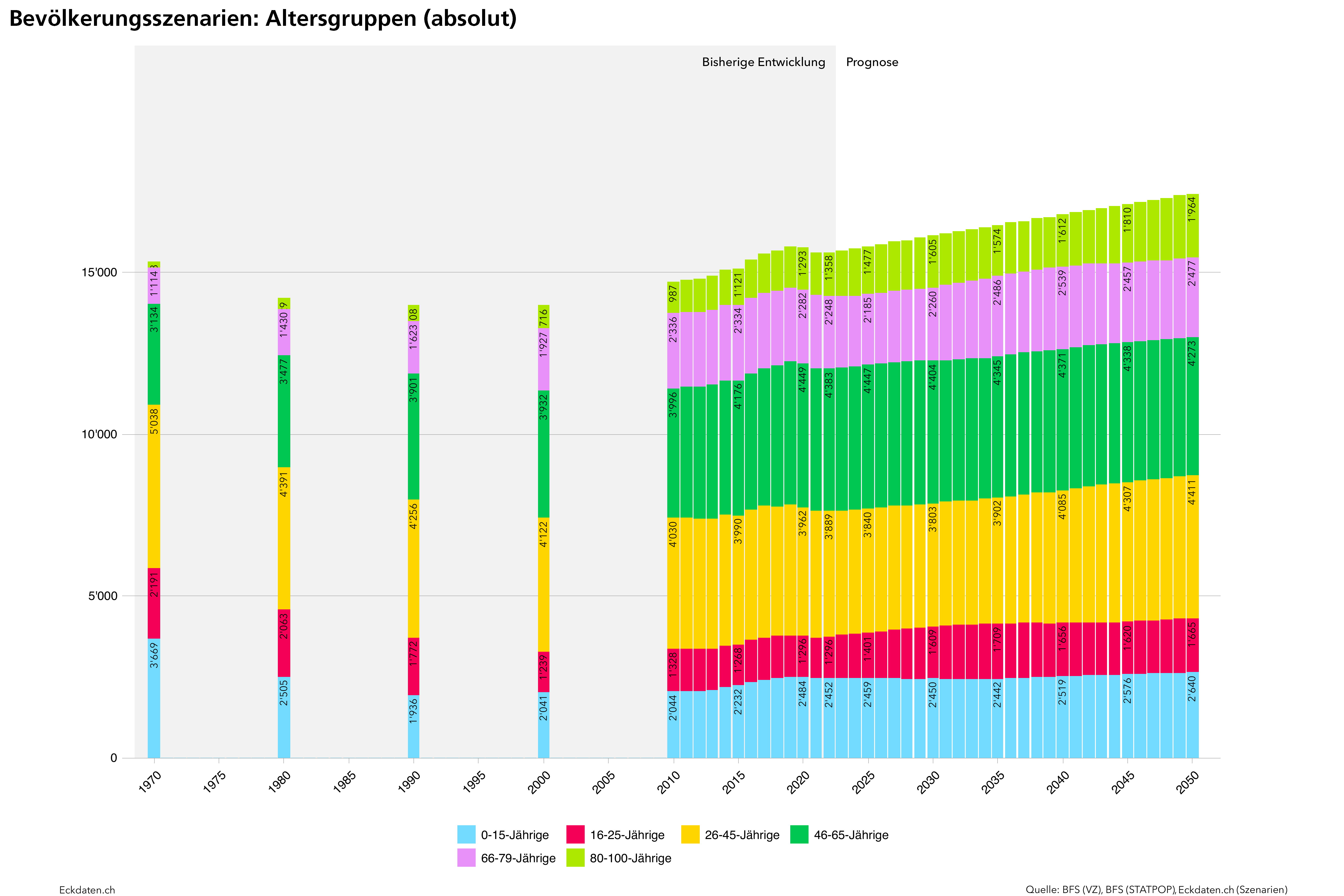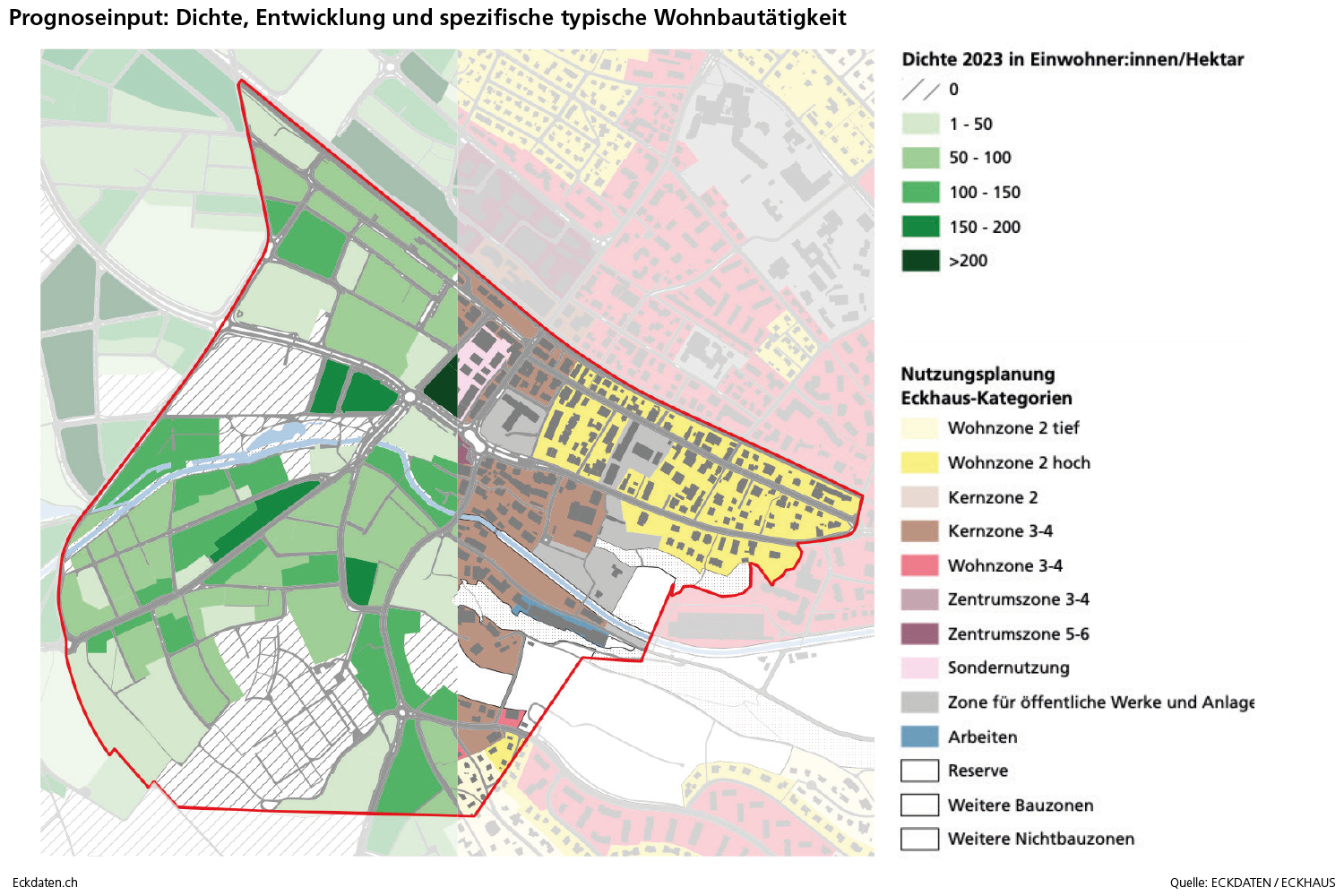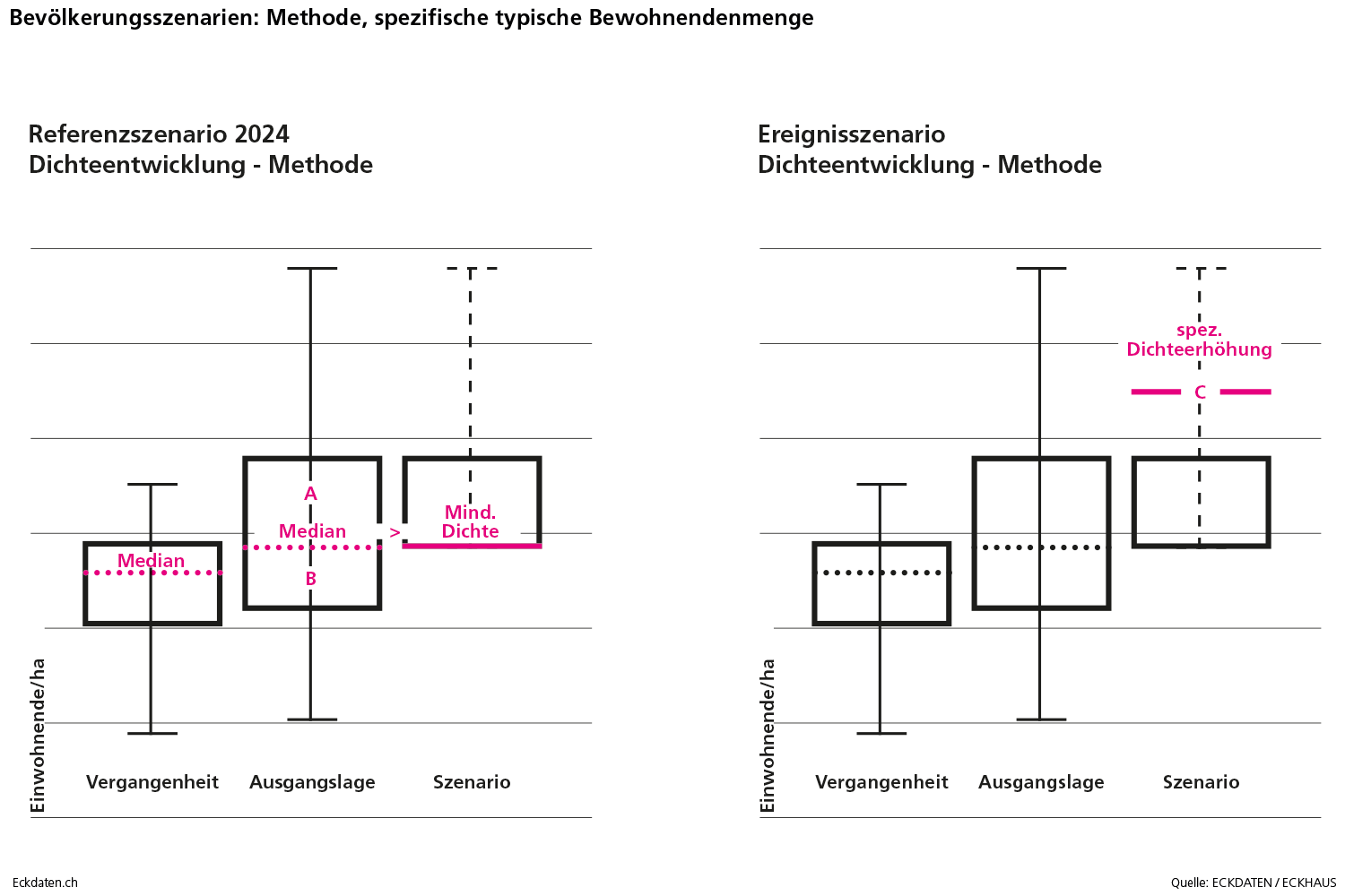 Die Eckdaten-Methode zur Modellierung von Bevölkerungsszenarien basiert im Wesentlichen auf der Analyse der Bautätigkeit und Dichteentwicklung des Siedlungsgebietes sowie der Analyse spezifischer Parameter der Bevölkerungsbewegung (Geburtenentwicklung, Zu-/Wegzugsverhalten, Sterblichkeit). Die Methode ist modular aufgebaut und reagiert auf die Verfügbarkeit der Inputs. Die Analysen und Berechnungen werden zeitlich eingebettet in eine 10 bis 50 Jahre zurückreichende räumliche Vergangenheitsbeobachtung der Gemeinde und Quartiere, relevanten Drittgemeinden sowie dem Kanton und in Bezug gesetzt zum Referenzszenario des Bundesamtes für Statistik. Die Szenarien basieren auf der ständigen Wohnbevölkerung, welche anhand der spezifischen Inputs auf der Ebene von Ein-Jahres-Altersklassen und für zwei Bevölkerungsgruppen (weiblich/männlich) jahrweise fortgeschrieben wird.