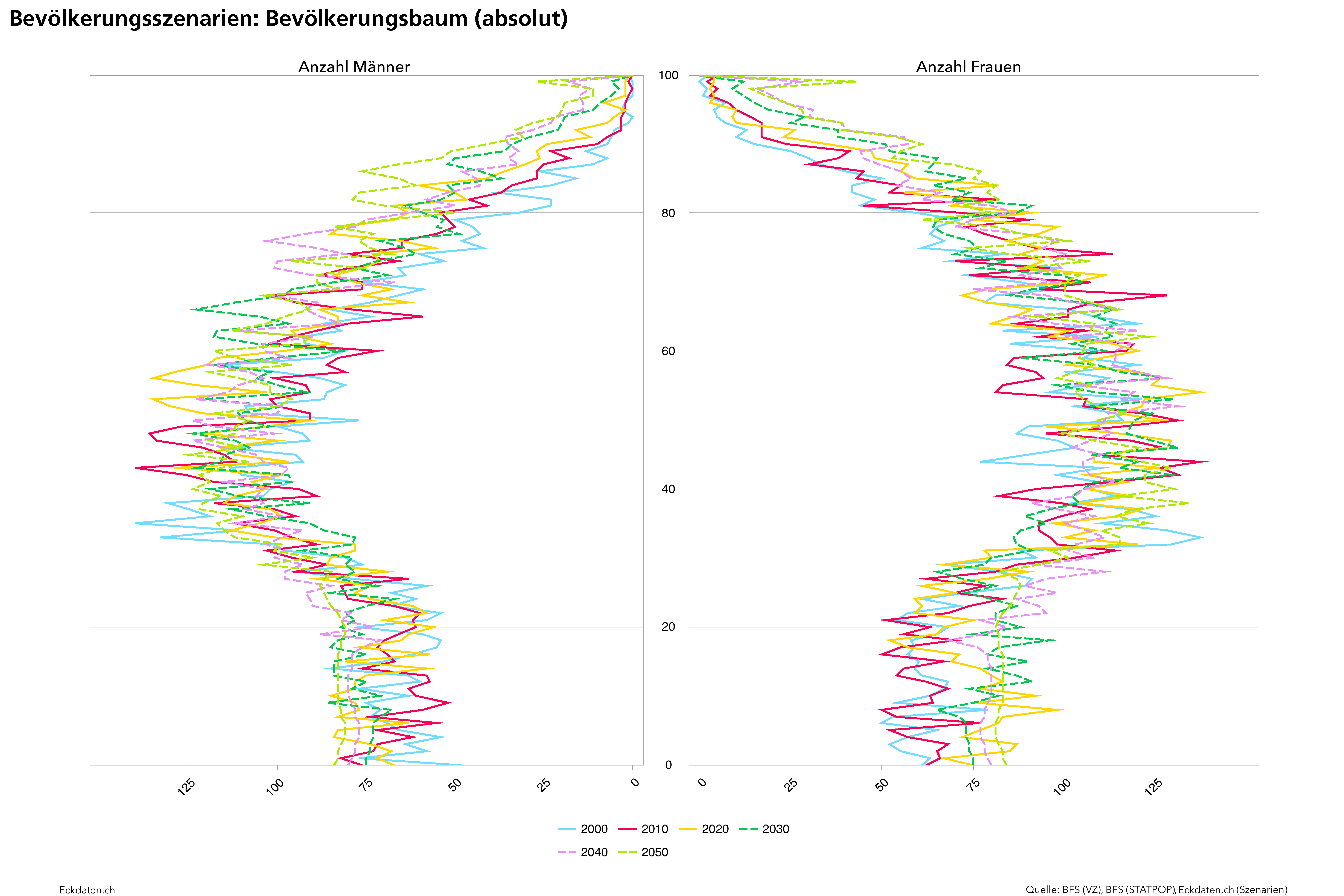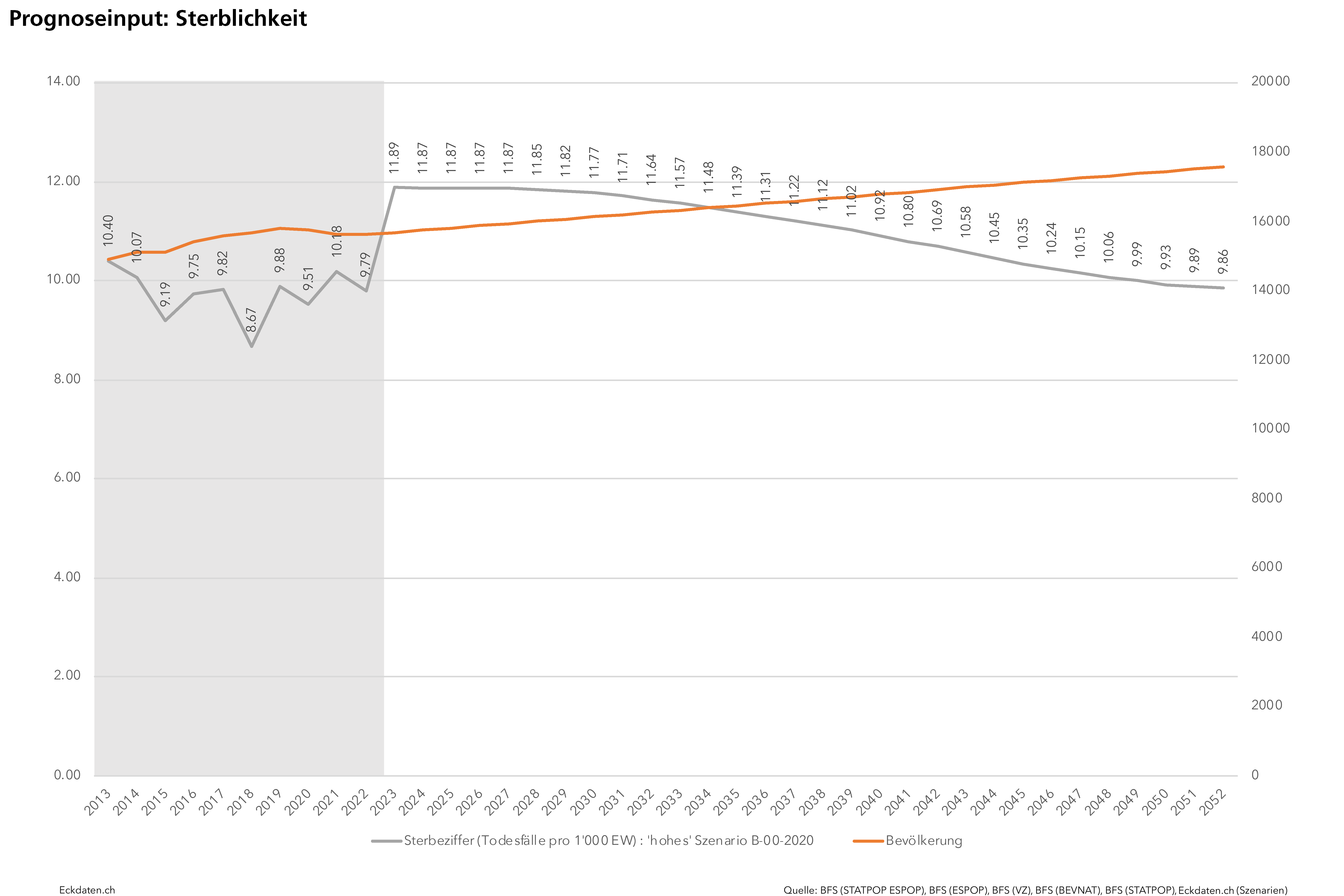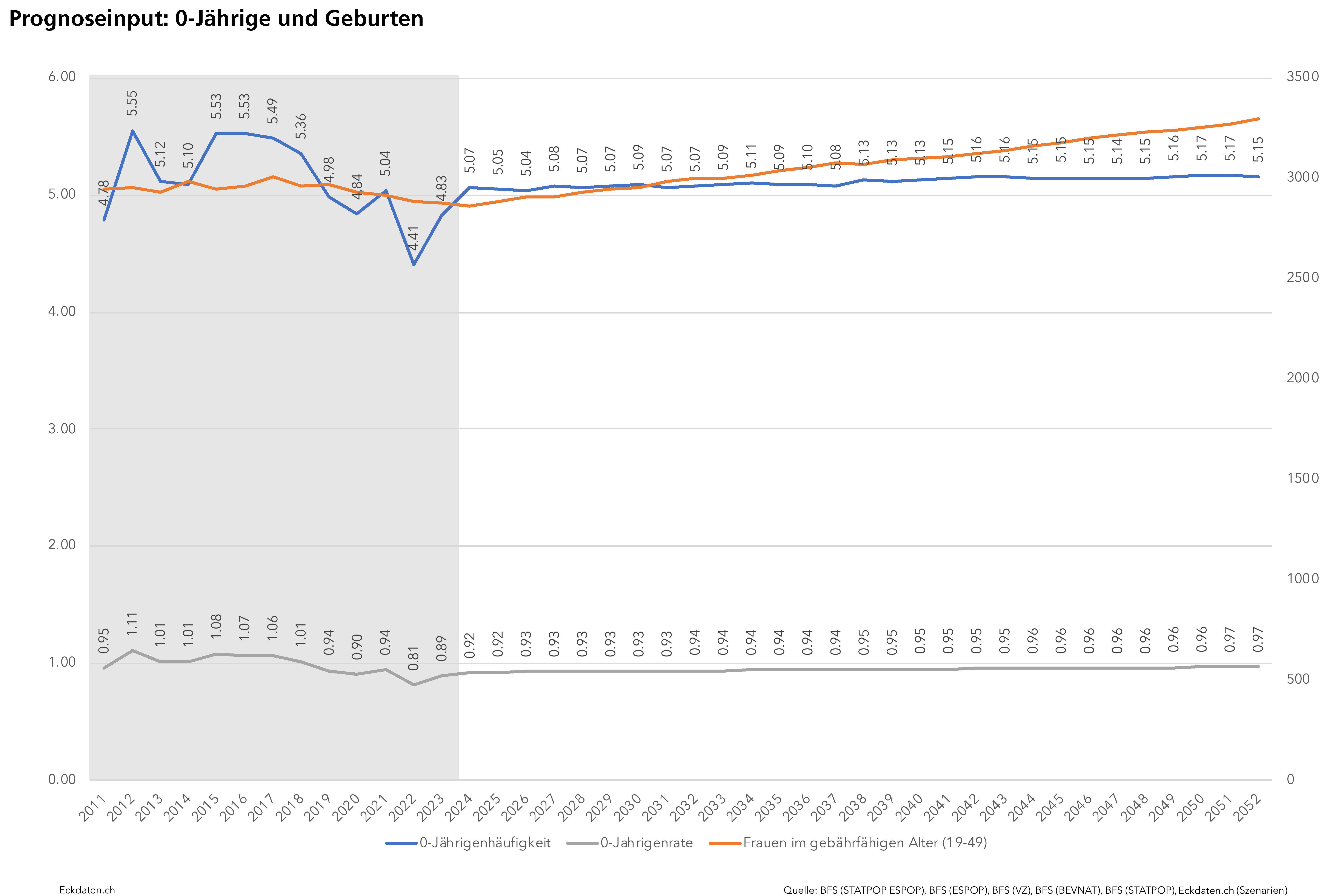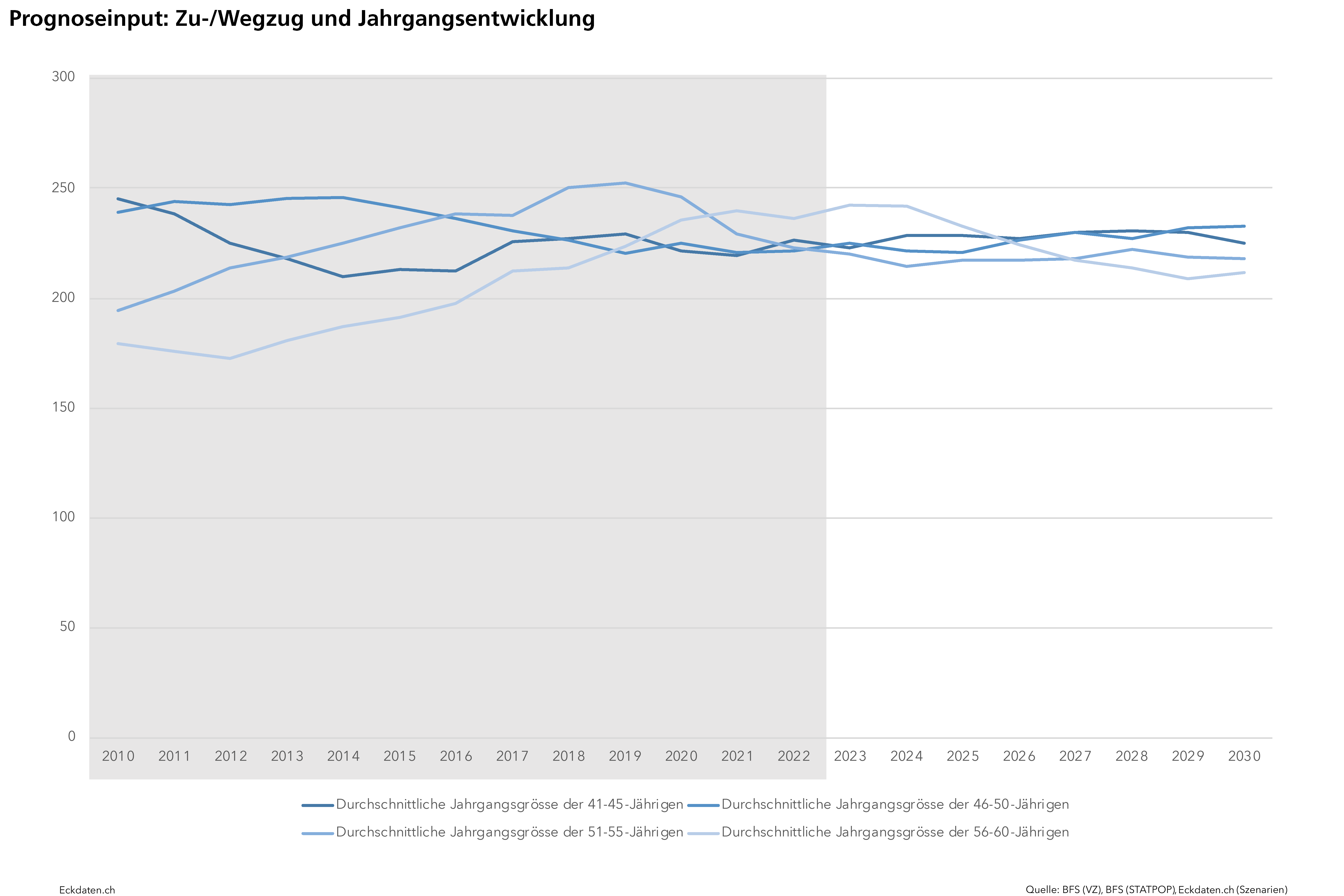 Die Eckdaten-Methode zur Modellierung von Bevölkerungsszenarien basiert im Wesentlichen auf der Analyse der Bautätigkeit und Dichteentwicklung des Siedlungsgebietes sowie der Analyse spezifischer Parameter der Bevölkerungsbewegung (Geburtenentwicklung, Zu-/Wegzugsverhalten, Sterblichkeit). Die Methode ist modular aufgebaut und reagiert auf die Verfügbarkeit der Inputs. Die Analysen und Berechnungen werden zeitlich eingebettet in eine 10 bis 50 Jahre zurückreichende räumliche Vergangenheitsbeobachtung der Gemeinde und Quartiere, relevanten Drittgemeinden sowie dem Kanton und in Bezug gesetzt zum Referenzszenario des Bundesamtes für Statistik. Die Szenarien basieren auf der ständigen Wohnbevölkerung, welche anhand der spezifischen Inputs auf der Ebene von Ein-Jahres-Altersklassen und für zwei Bevölkerungsgruppen (weiblich/männlich) jahrweise fortgeschrieben wird.
