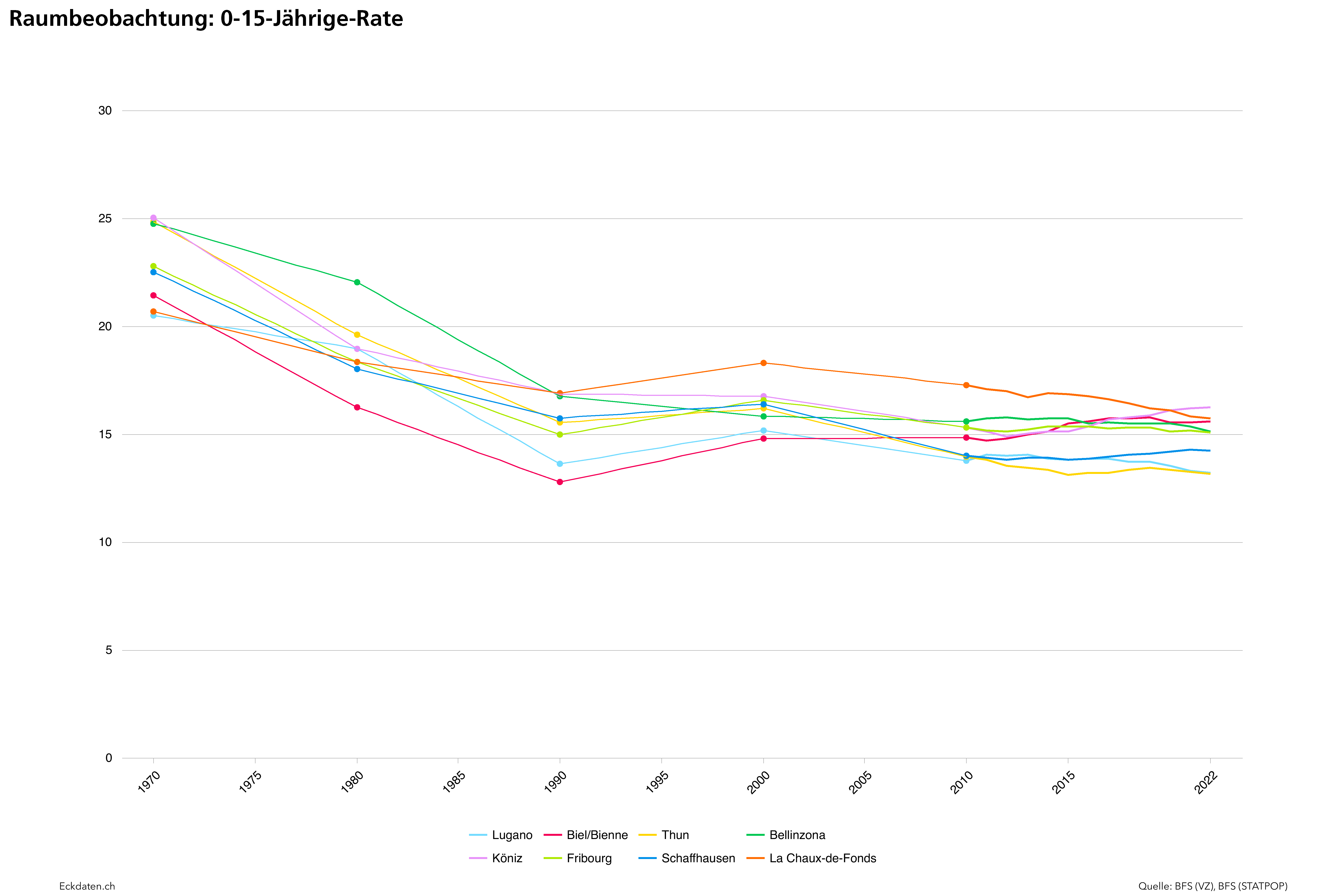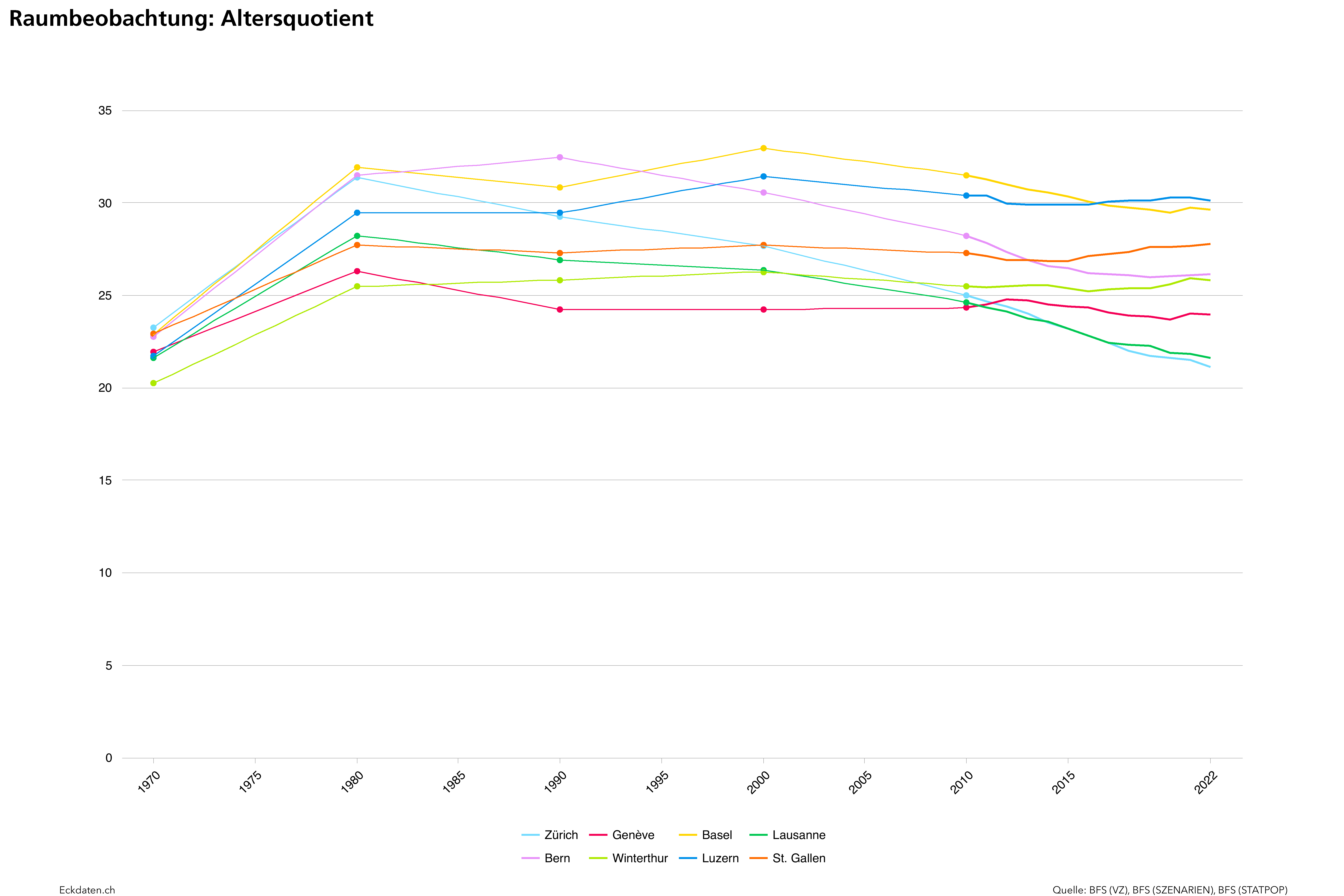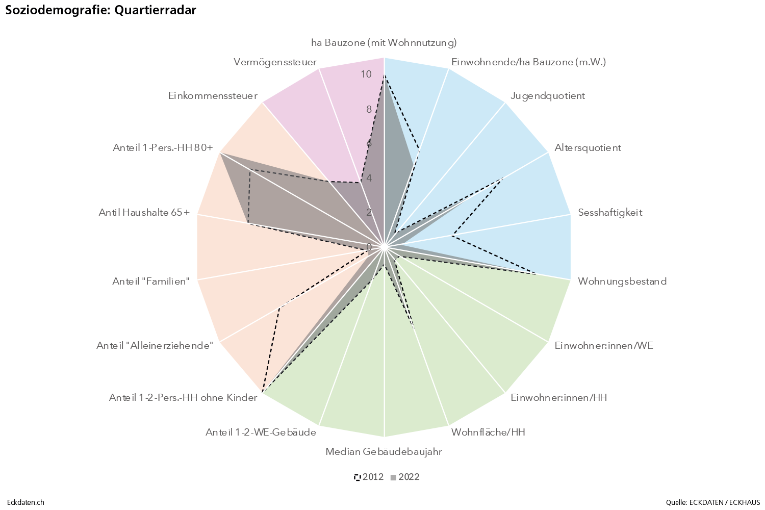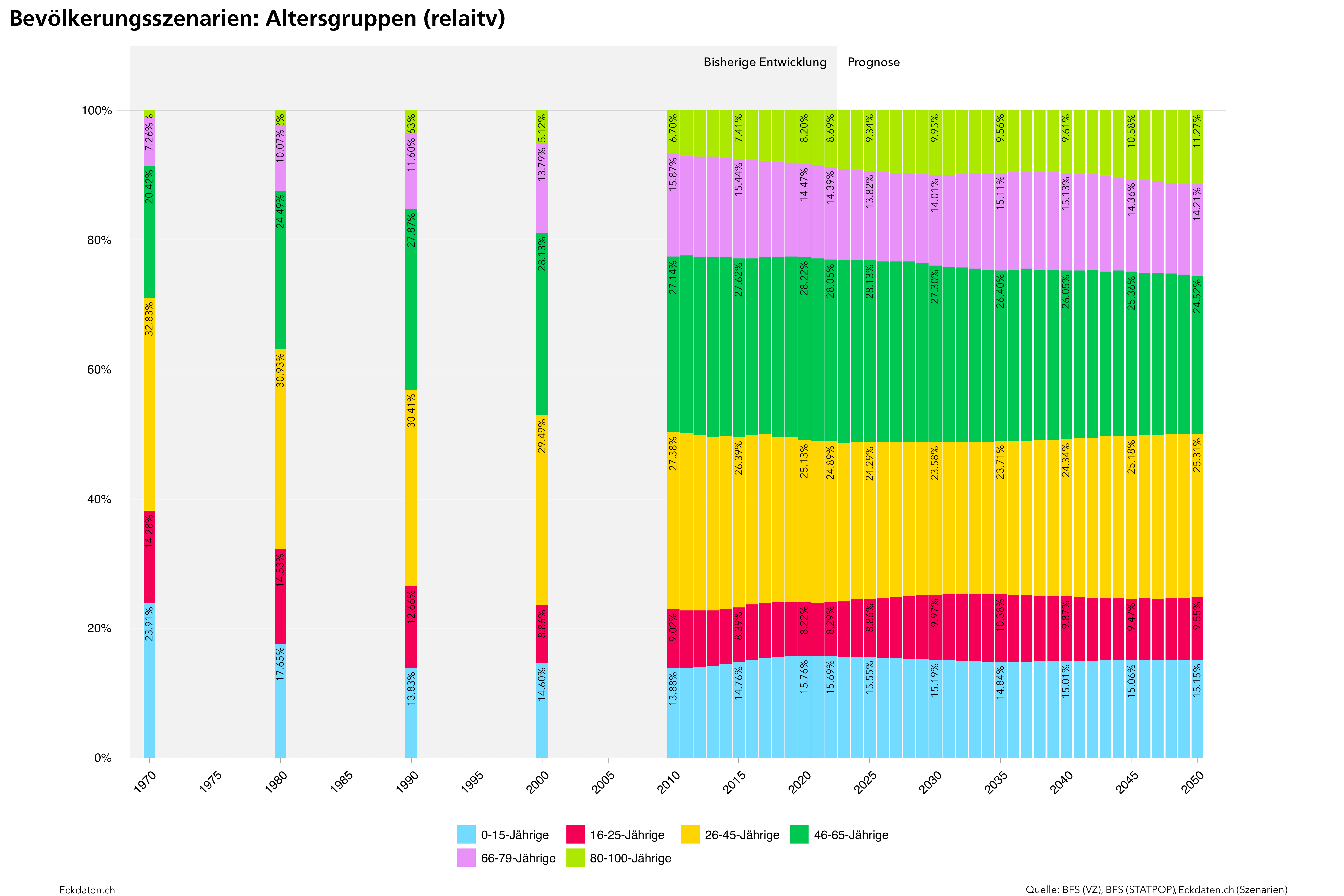 Die Eckdaten-Methode zur Modellierung von Bevölkerungsszenarien basiert im Wesentlichen auf der Analyse der Bautätigkeit und Dichteentwicklung des Siedlungsgebietes sowie der Analyse spezifischer Parameter der Bevölkerungsbewegung (Geburtenentwicklung, Zu-/Wegzugsverhalten, Sterblichkeit). Die Methode ist modular aufgebaut und reagiert auf die Verfügbarkeit der Inputs. Die Analysen und Berechnungen werden zeitlich eingebettet in eine 10 bis 50 Jahre zurückreichende räumliche Vergangenheitsbeobachtung der Gemeinde und Quartiere, relevanten Drittgemeinden sowie dem Kanton und in Bezug gesetzt zum Referenzszenario des Bundesamtes für Statistik. Die Szenarien basieren auf der ständigen Wohnbevölkerung, welche anhand der spezifischen Inputs auf der Ebene von Ein-Jahres-Altersklassen und für zwei Bevölkerungsgruppen (weiblich/männlich) jahrweise fortgeschrieben wird.